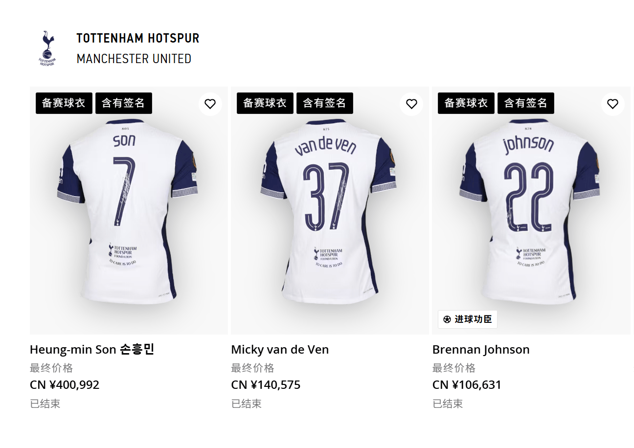 虎扑06月08日讯 在国外落场球衣拍卖网站上,热刺欧联决赛落场球衣被拍卖。在这场比赛中,热刺1-0战胜曼联,取得球队17年来第一座冠军奖杯。本场比赛中,布伦南-约翰逊破门建功,他的球衣以约10万人民币的价格成交,位列第三。价格第二高的是范德芬的球衣。在比赛中,他用一次门线精彩解围保住球队的领先优势。队长孙兴慜的球衣以约40万人民币的价格成交,大幅领先于第二名范德芬的约14万人民币。